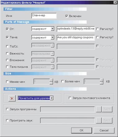 Для чего она нужна? Прежде всего, для борьбы со спамом. Кроме того, можно назначать составные фильтры по теме, адресу отправителя, важности, именам вложенных файлов и по многим другим параметрам. Особенно удобна функция привязки конкретного фильтра к какой-нибудь внешней программе. Тогда при получении определенного письма будет происходить некое заранее определенное событие, например запуск Microsoft Excel или формирование какого-то отчета.