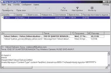 Однако, к сожалению, в данном окне не указывается число поступивших сообщений и не приводится перечень их заголовков. Впрочем, нажав кнопку Yes, можно получить доступ к такой информации (рис. 7), но это, по-моему, не очень удобно. К несомненным достоинствам программы относятся возможность автоматического соединения с провайдером через коммутируемые соединения Windows, что, кстати, реализовано и в 7Way Email Checker.