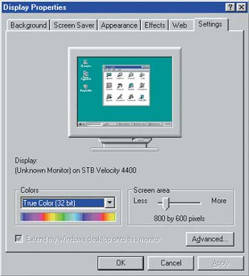 Чтобы найти настройки видеоадаптера, либо щелкните правой кнопкой мыши на Рабочем столе и в появившемся меню выберите пункт «Свойства», либо укажите опции «Пуск?Настройка?Панель управления» и дважды щелкните на значке «Экран» (см. рисунок). На закладке «Настройка» окна свойств экрана в «Области экрана» задается разрешение монитора, а в поле «Цветовой палитры» — количество воспроизводимых цветов, иначе говоря, цветовая глубина. Параметр «Частота обновления» (его настройка открывается щелчком на кнопке «Дополнительно» и закладке «Адаптер») определяет, сколько раз в секунду перерисовывается изображение.