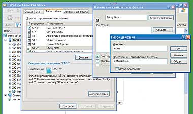СОВЕТ. Чтобы использовать этот примитивный метод, откройте Проводник (или любое окно с папками), затем выберите (в зависимости от версии Windows) раздел «Вид?Свойства папки» (View?Folder Options) или «Сервис?Свойства папки» (Tools?Folder Options). Нажмите на закладку «Типы файлов» (File Types) и затем выберите «Создать» (New) или «Новый тип» (New Type). В Windows 2000, Windows Mе и Windows XP наберите stky в поле для расширения файла и нажмите OK. В списке «Зарегистрированные типы файлов» (Registered file types) выделите запись stky и нажмите «Дополнительно» (Advanced).