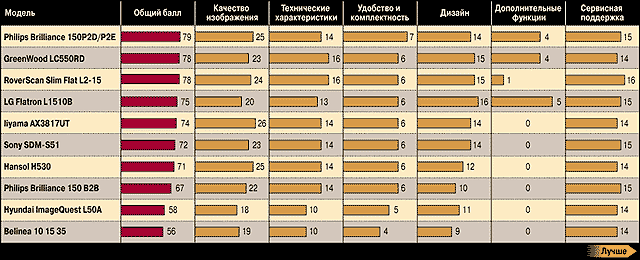 Общий балл формировался из следующих составляющих: качество изображения — 30%, технические характеристики — 20%, удобство эксплуатации и комплектность — 8%, дизайн — 20%, сервисная поддержка — 16%, дополнительные функции — 6%.