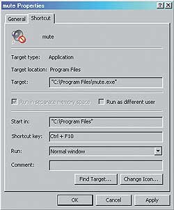 Управление с клавиатуры. Чтобы включать и выключать звук с помощью клавиатуры, создайте ярлык для утилиты Mute и поместите его на Рабочий стол или в какую-нибудь папку в иерархии Главного меню. Я рекомендую для этого организовать папку под названием «Быстрые клавиши» (или Keyboard Shortcuts, если угодно) в «Главном меню/Программы». Это позволяет легко найти сведения о быстрых клавишах, если вам когда-либо понадобится их удалить или заменить.