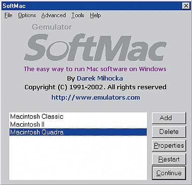 SoftMac Classic. Программа SoftMac Classic разработана компанией Emulators Inc. И по сути бесплатно демонстрирует возможности коммерческого продукта SoftMac XPress. «Классическая» версия умеет эмулировать процессоры MP 68020/30/40, позволяет выделить до 32 Мбайт оперативной памяти для использования Mac OS, поддерживает работу с файлами-образами жестких дисков. Кроме того, имеется возможность подключать SCSI-приводы, просматривать CD и DVD-диски, созданные для Macintosh, и выбирать наиболее подходящее для работы экранное разрешение (из семи доступных).
