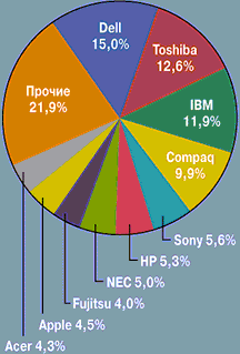 Если же говорить о производстве подобной техники, напомним, что Тайвань подключился к выпуску ноутбуков не вчера. Так, уже в 1997 г. доля тайваньских компаний, занимающихся их сборкой, составляла 31,5%. По итогам прошлого года эта цифра возросла до 52,5% и, если верить прогнозам, удержится на этом же уровне и в текущем году. Отметим, что в 2001 г. доход от продажи техники данного класса по сравнению с 2000 г. во всем мире снизился на 11% (с 15,326 до 13,65 млрд. евро).