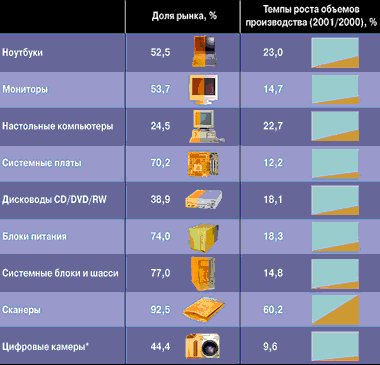 Одни (Asustek, AOpen, ECS, FIC, QDI) принимают решение начать собственное производство ноутбуков, другие (Gigabyte, EPoX, ACorp, Asustek, MSI) осваивают сетевые технологии, третьи (Abit, Iwill, Tyan) выбирают цель стать основными поставщиками серверных платформ, четвертые (AOpen, MSI, ACorp, Asustek) планомерно наращивают свое присутствие на рынке оптических устройств записи и хранения данных. При этом почти каждый не забывает, помимо ставших своеобразной визитной карточкой системных плат, исправно выпускать графические ускорители, Barebone-системы (базовые комплекты для самостоятельной сборки), а с некоторых пор еще и КПК, ППК и даже мобильные телефоны (в планах Asustek на 2002 г.). Для кого-то этот дополнительный бизнес — пока лишь наглядная и, надо сказать, довольно убедительная демонстрация своих возможностей компаниям с мировым именем, занятым поиском ОЕМ-партнеров, для других — уже ощутимое подспорье в бесконечной гонке за ростом финансовых показателей.
