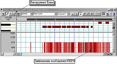 Удалить нежелательные события можно также, если проделать аналогичные действия, но вместо пункта Event List выбрать Piano Roll («Клавишный редактор»). И работать в этом окне, на мой взгляд, быстрее и проще. События Filter Q и Filter Cutoff представляют собой так называемые NRPN (Non Registered Parameter Numbers). На рис. 4 видно, что выбрать их можно в полях, расположенных в верхней части окна Piano Roll, а удалить — щелкнув на инструменте Erase («Удалить») левой кнопкой мыши и проведя курсором по записанным событиям (последние обозначаются красными вертикальными палочками в нижней части окна, а сами ноты — красными горизонтальными прямоугольниками).
