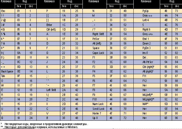 * Нестандартные коды, введенные в предлагаемом драйвере клавиатуры. ** Некоторые дополнительные клавиши, используемые в Windows. |
