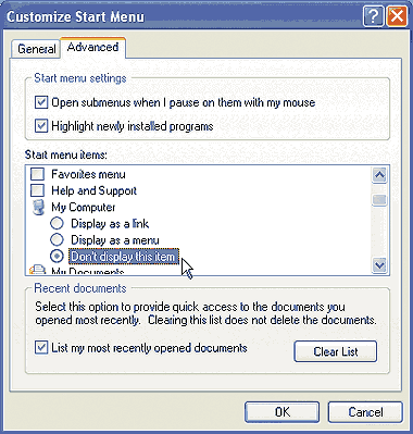 Система Windows XP значительно упрощает удаление многих встроенных позиций Главного меню, что является хорошей новостью, ведь эта ОС еще и добавляет в Главное меню много всякого мусора. Щелкните правой кнопкой мыши на кнопке «Пуск» (Start), отметьте пункт «Свойства» (Properties), укажите «Настроить» (Customize) и выберите закладку «Дополнительно» (Advanced). В списке «Элементы меню «Пуск» (Start menu items) можно выбрать опцию «Не отображать этот элемент» (Don?t display this item) для позиций «Панель управления» (Control Panel), «Мой компьютер» (My Computer), «Мои документы» (My Documents), «Моя музыка» (My Music), «Мои рисунки» (My Pictures), «Сетевые подключения» (Network Connections) и «Администрирование» (System Administrative Tools).