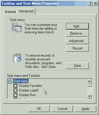 Чтобы избавиться от позиций «Избранное» и «Завершение сеанса» в Windows 2000 и Me, щелкните правой кнопкой мыши на Панели задач, отметьте пункт «Свойства», щелкните на закладке «Дополнительно» и в нижней части диалогового окна списка настроек выключите функции «Отображать папку «Избранное» и «Отображать команду «Завершение сеанса». Если вы никогда не используете команду «Пуск?Выполнить» или предпочитаете для ее выполнения клавиатуру ( + R), то система Windows Me позволяет отключить функцию «Отображать команду «Выполнение». Сделав все это, нажмите OK.