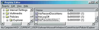 Перед тем как начать «причесывать» Главное меню, логически упорядочите свои меню быстрого доступа и удалите ненужные позиции. Простого способа убрать последние в Windows 9x нет, но для некоторых из них это можно сделать путем редактирования Реестра. Испортить настройки Реестра было бы слишком рискованно, поэтому заранее позаботьтесь о резервных копиях файлов system.dat и user.dat. Выполните это, укажите «Пуск?Выполнить», введите команду regedit и нажмите — откроется Редактор реестра. В левой секции найдите HKEY_ CURRENT_USERSoftwareMicrosoft WindowsCurrentVersionPolicies