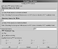 Использование FTP. Этот протокол изначально был предназначен для обмена файлами. Скорость передачи данных достигается практически максимально возможная и заметно превышает скорость, обеспечиваемую протоколом AppleTalk, что немаловажно для таких областей, как видеопроизводство и полиграфия. Настроить FTP-сервер (опять-таки исходя из минимальных требований) крайне несложно (рис. 5). Встроенный в Windows NT (так же как и в Windows 2000 и Windows XP) универсальный IIS хотя и имеет много нареканий из-за проблем с безопасностью, вполне пригоден для передачи файлов внутри локальной сети дома или в офисе. Настройка его также не требует больших усилий (рис. 6).