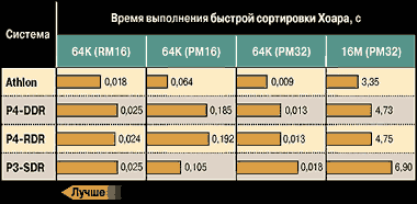Безусловным лидером во всех этих задачах стал AMD Athlon XP. Сортировка — процедура рекурсивная. В процессе рекурсии объем обрабатываемых данных быстро сокращается и становится меньше размера кэша первого уровня, в то же время алгоритм изобилует условными переходами и вызовами процедур, т. е. логикой исполнения, с которой Athlon справляется гораздо лучше.