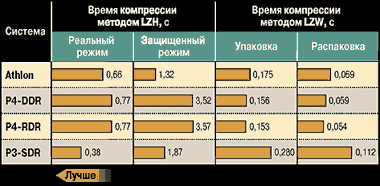 В тесте с LZH безусловным лидером оказался Pentium III; несмотря на двукратное превосходство «четверки» по тактовой частоте, она во столько же раз отстала по производительности. Итого: разница более чем вчетверо. При переходе в защищенный режим лидером стал Athlon, а двукратное отставание P4 от P3 сохранилось. Athlon же обходит своего конкурента почти втрое.