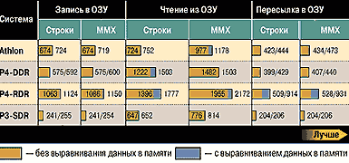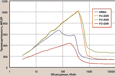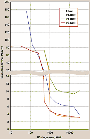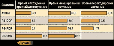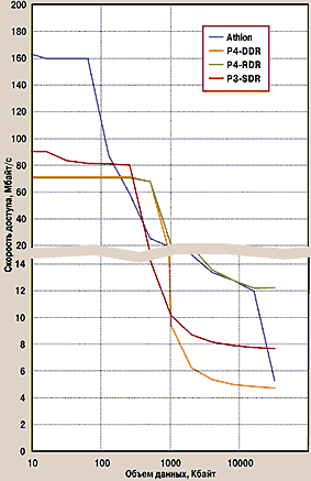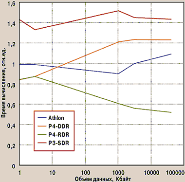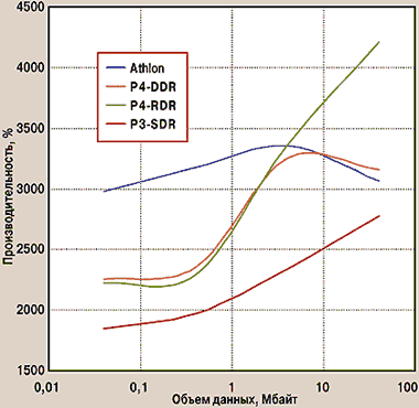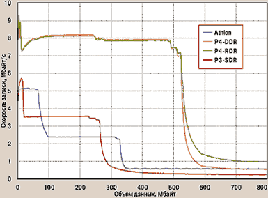 Что касается больших объемов записываемых данных, то здесь зависимости от типа процессора не наблюдается: все определяется типом памяти. На первое место вышла система с Rambus RAM (RDR), на второе — с DDR (независимо от типа процессора) и на третье — с обычной SDRAM, которую в последнее время стало принято именовать SDR RAM.
