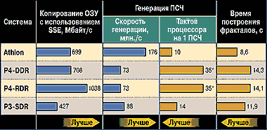 Гораздо хуже для изделия AMD обстоят дела с перекодировкой цвета. С одной стороны, значительный объем данных (2 Мбайт на входе и 1 Мбайт на выходе) при малом времени преобразования наводит на мысль, что определяющее влияние здесь должна иметь скорость работы памяти. Для двух конфигураций Pentium 4 такое влияние отчетливо просматривается. Но с другой стороны, при надлежащей организации блока ММХ обе системы на DDR должны показывать близкую производительность. Этого, однако, не наблюдается, что еще раз подтверждает низкую производительность блока ММХ у процессора AMD. Заметим, что ММХ — не что иное, как средство быстрой обработки больших объемов данных. Между тем мы видели, что даже при применении таких традиционных средств, как блок вычислений с плавающей точкой, производительность зачастую ограничивается памятью, а новый процессор Intel гораздо быстрее работает с собственным кэшем. Поэтому вполне вероятно, что низкая производительность блока ММХ связана не со схемотехникой самого блока, а с различной скоростью кэша. Не вдаваясь в подробности, можно лишь констатировать относительно низкую производительность процессора AMD на приложениях, использующих инструкции SIMD. К сожалению, из-за особенностей видеоплаты провести последний тест на ПК с Pentium III не удалось.