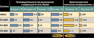 Перейдем к вычислениям с плавающей точкой. Классической контрольной задачей здесь является тест Ветстоуна. В диаграмме 3 приведены результаты, отражающие производительность, показанную в этом тесте 16- и 32-разрядными компиляторами Фортрана (в классической постановке), а также 16- и 32-разрядными компиляторами Паскаля (в переписанном на Паскаль виде). Последнее представляет интерес, поскольку степень оптимизации компиляторов Паскаля, как правило, ниже, чем Фортрана, так как традиционно не привязана к конкретному типу процессора. И тут во всех тестах лидер прежний — Athlon. В 16-разрядных приложениях второе место безоговорочно занимает Pentium III, а в 32-разрядных от него все же немного оторвался Pentium 4. При расчете оптических коэффициентов, где используются интенсивные тригонометрические вычисления (в этом отношении тест походит на современные 3D-игры), Pentium 4 снова оказался в аутсайдерах (справедливости ради заметим, что в данной программе не используется его уникальное расширение SSE2, но явно низкая производительность основного процессорного ядра не вызывает сомнений).