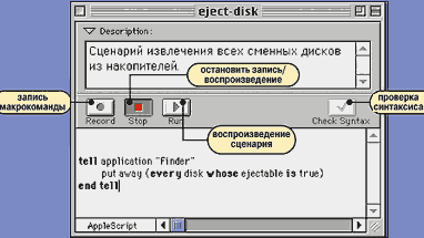 Существует также альтернативный способ получения действующих сценариев минуя их ручной набор. Технология AppleScript проектировалась с расчетом на то, что она будет применяться для записи макрокоманд. Некоторые приложения, в основном из числа тех, что разработаны программистами Apple, позволяют автоматически создавать сценарии - в процессе выполнения нужных последовательностей действий. Чтобы воспользоваться такой возможностью, следует в Script Editor включить режим записи, перейти в необходимое приложение и приступить к работе. Все операции, осуществляемые в это время, будут переводиться в команды языка AppleScript. Таким образом, можно легко получить черновой вариант сценария и затем, проведя незначительную доработку, превратить его в программу пакетной обработки данных.