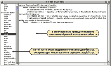 Еще одна особенность редактора Script Editor, которую нельзя обойти вниманием, - отображение словарей приложений. Если в меню выбрать команду File*Open Dictionary ("Файл*Открыть словарь"), а в появившемся диалоговом окне открыть исполняемый файл какого-нибудь программного пакета, Script Editor проанализирует код выбранной программы и отобразит информацию о поддерживаемой объектной модели. Эти сведения выводятся в окне, которое можно видеть на рис. 3: в правой части - список доступных команд и объектов, в левой - их краткое описание.