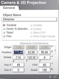 Ниже находится матрица 3x3, в которой хранятся абсолютные координаты камеры. Здесь вы можете задать ее расположение и угол вращения. Еще ниже имеются поля Pan V и Pan H — они, как и переключатели сверху, отвечают за смещение камеры, просто оно представлено здесь в другой форме. А справа внизу есть поля FOV и Scale. Первое поле определяет фокусное расстояние камеры, а второе — масштаб изображения.