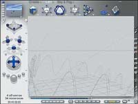 На рис. 1 изображен интерфейс пакета. В центре расположено окно просмотра сцены, в котором немедленно отображаются все операции по размещению или перемещению объектов. Оно и является рабочей областью программы. В отличие от более сложных редакторов, здесь нет возможности просмотра сцены одновременно с разных позиций в нескольких открытых окнах. Для перемещения по сцене существует панель слева, где расположены средства навигации.