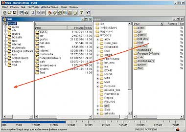 В действительности же все просто: в левой части* главного окна, в поле ISO, находятся окна создаваемого проекта (так громко называется диск, который мы будем записывать), а в правой части — знакомые по Windows окна Проводника. Немного об особенностях окон проекта. В левой части окна пользователь вдумчиво наблюдает корневую папку создаваемого диска, а в правой — содержимое нужной папки на CD, если таковую выделить мышью. Если при создании мультисессионного диска (т. е. такого, который можно дописывать за несколько приемов) возникнет необходимость дополнительно записать какие-то файлы/папки в конкретную папку, нужно просто перетащить добавляемую информацию не в левое окно проекта (корневую папку диска), а именно в правое. Тогда нужные файлы запишутся как раз в ту папку, которую мы и выбрали для дальнейшего добавления файлов.