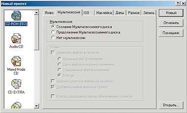 Открываемая по умолчанию при создании проекта вкладка «Мультисессия» (Multisession) позволяет либо создать мультисессионный диск (т. е. диск, допускающий дальнейшее добавление файлов, если есть место на «болванке»), либо продолжить мультисессионный диск, либо, наконец, не жадничать и создать финализированный («закрытый») диск, дальнейшая запись на который невозможна. Вкладка ISO отвечает за отображение символов в именах файлов и папок (11 или 31 символ), а также за сам набор этих символов. Так, при выборе варианта ISO 9660 все имена будут отображаться заглавными буквами, а если указать ASCII, то можно написать название как захочется, в том числе и с пробелами. На вкладке «Наклейка» (Label) в поле «Метка тома» (Volume Label) нужно вписать название диска, которое будет отображаться в Проводнике Windows при дальнейшем использовании CD.