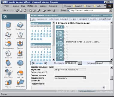 Однако указанные выше программные продукты ориентированы в первую очередь на крупные компании. Небольшим и средним организациям, желающим получить конкурентное преимущество за счет «мобилизации» своих сотрудников, могут оказаться не по плечу необходимые финансовые расходы. В этом случае можно остановить свой выбор на, прямо скажем, не таких знаменитых, но обладающих неменьшими возможностями программных продуктах. Например, на серии продуктов MIO — Mobile Internet Office (www.mobico.ru), кстати, разработанных в России и появившихся в продаже в мае 2001 г. Наряду со стандартным набором почтовых, организационных и коммуникативных сервисов для стационарных пользователей они дают оперативный доступ ко всем перечисленным сервисам и для мобильных пользователей. А стоят гораздо дешевле. Да и проверены более чем на 1 млн. российских пользователей (продукты MIO используются Интернет-порталом «Рамблер» для построения своих публичных сервисов: почта, чат, календарь и т. п., а о регистрации миллионного пользователя почты «Рамблер» было объявлено в новостях еще в сентябре 2001 г.).