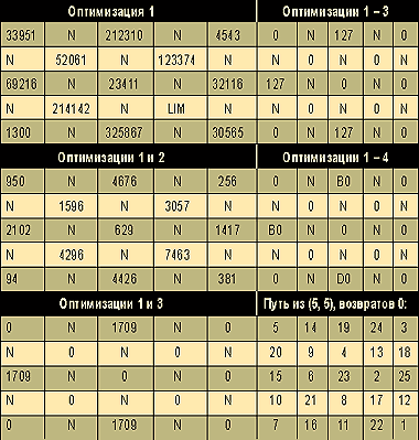 Для примера рассмотрим результаты обхода некоторых досок. Для доски размером 5x5 клеток приводится таблица, где указывается количество возвратов, выполненное при нахождении обхода из соответствующей клетки (табл. 2). В случае отсутствия обхода в клетке ставится символ N, а если количество возвратов превысило задаваемую в программе величину (MAX_RET = 400 000), то поиск пути прекращается, а в соответствующей клетке выводится сокращение LIM. В таблицах, построенных для метода оптимизации, когда используются различные массивы вариантов для хода коня, в клетке дополнительно дается обозначение того массива (от A до E), при применении которого обход совершался без возвратов (GOOD_RET = 1). Причем если результат был получен для первого массива, то соответствующий ему символ A не выводится.