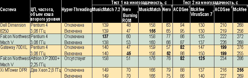 Как проводилось тестирование. В тесте на работу приложения Musicmatch Jukebox 7.2 как единственной задачи мы измеряли время преобразования десяти файлов формата WAV в файлы формата MP3; в тесте на работу Nero Burning ROM как единственной мы измеряли время создания 490-Мбайт образа жесткого диска. В первом тесте на многозадачность мы измеряли время работы MusicMatch в качестве приоритетной задачи при одновременной работе Nero в фоновом режиме. В тесте на работу ACDSee 5 как единственной задачи измерялось время преобразования 315 файлов формата TIFF в файлы формата JPEG; в тесте на работу с McAfee VirusScan 7.0 Home Edition мы измеряли время сканирования каталога, чтобы проверить их на наличие вирусов. Во втором тесте на многозадачность определялось время работы ACDSee в качестве приоритетной задачи при одновременной работе McAfee в фоновом режиме. Во всех случаях меньшее значение показателя соответствует лучшему результату. Тесты разработаны и проведены Тестовым центром журнала PC World.