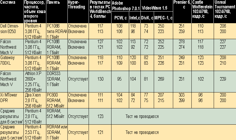 Как проводилось тестирование. Все ПК исследовались с помощью PC WorldBench 4, эталонного теста журнала PC World, основанного на выполнении реальных приложений (см. www.pcworld.com/benchmark). В тесте на работу с Photoshop 7.0.1 сначала мы измеряли время применения 20 часто используемых фильтров к некоторому изображению (PCW), а потом — время наложения на ту же картинку 20 фильтров, предписанных компанией Intel. В тестах на работу с приложением Roxio VideoWave 1.5 мы засекали сначала время преобразования «сырого» видеофайла в файл DivX со звуком, а затем длительность преобразования «сырого» видеофайла в другой видеофайл и потом в файл MPEG-1 (оба со звуком). В тесте на работу с приложением Adobe Premier 6 определялось время преобразования «сырого» видеофайла в два законченных файла. В тестах с применением игр Return to Castle Wolfenstein и Unreal Tournament 2003 измерялись частота кадров при воспроизведении записанного демонстрационного ролика и быстрого прохождения через один игровой уровень соответственно.