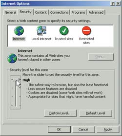 Так, слишком жесткими могут быть настройки, связанные с безопасностью. В Internet Explorer выберите «Сервис?Свойства обозревателя». Щелкните на закладке «Безопасность» и удостоверьтесь, что в списке зон отмечен «Интернет». Щелкните на кнопке «Уровень по умолчанию» и сдвиньте бегунок под заголовком «Уровень безопасности для этой зоны» на одно деление вниз, а затем снова попытайтесь зайти на интересующий вас сайт. Если браузер настроен на высокий уровень безопасности, попытайтесь установить его на средний, ниже среднего или даже низкий уровень, несмотря на предупреждения браузера о грозящей гибели. Чтобы вызвать диалоговое окно настройки безопасности, нажмите кнопку «Другой». Спускайтесь вниз к разделу сценариев и убедитесь, что выполнение сценариев Java разрешено.