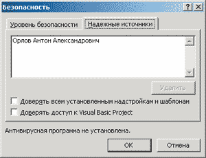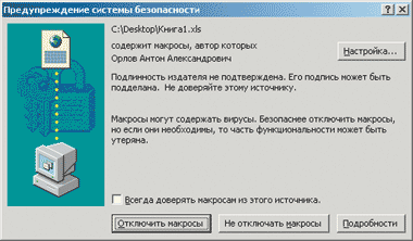 Однако при постоянной работе с файлами, содержащими программы на Visual Basic for Applications, то и дело появляющееся диалоговое окно с предупреждением изрядно надоедает и возникает желание, чтобы документы, созданные каким-либо одним человеком или группой лиц, открывались без запроса о запуске в них макросов, а при открытии всех остальных диалоговое окно по-прежнему отображалось. Именно для таких случаев и был создан механизм цифровой подписи.