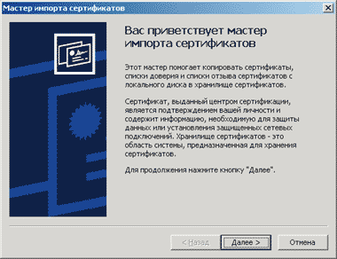 Затем в появившемся окне информации о сертификате надо нажать кнопку «Установить сертификат», и тогда запустится мастер импорта сертификатов (рис. 9).