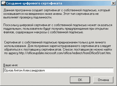 Цифровая подпись не подходит для аутентификации проектов на Visual Basic for Applications по имени или еще каким-либо данным ее создателя, т. е. с ее помощью нельзя убедить пользователя, что автором макросов в открываемом им файле является именно тот, чье имя высвечивается в диалоговом окне подтверждения разрешения на использование макросов. Значит, в программу Selfsert можно ввести любое имя, в том числе и принятое другим автором VBA-программ, однако доказать, что новый сертификат был создан не реальным владельцем этого имени, нельзя. Но это все-таки можно сделать, если обратиться в компанию VeriSign, занимающуюся их разработкой индивидуально для каждого клиента, или в любую ей подобную (адреса фирм приведены в разделе «Цифровые подписи» справочной системы Microsoft Office). Кроме того, программа Microsoft Certificate Server позволяет делать сертификаты, не поддающиеся подделке.