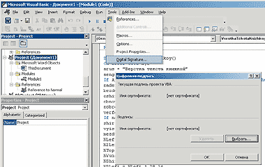 Новый сертификат с цифровой подписью можно применять сразу же после его появления. Например, чтобы подписать им новый проект на Visual Basic for Applications, следует выделить какой-либо компонент этого проекта (в частности, его название), а затем выбрать из пункта меню Tools в редакторе VBA пункт Digital Signature (рис.4) и в появившемся диалоговом окне «Цифровая подпись» нажать одноименную кнопку для выбора сертификата.