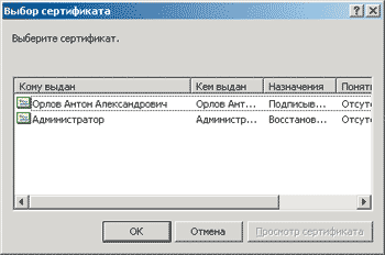 В открывшемся диалоговом окне (рис.5) можно выбрать прикрепляемый сертификат. Если создать множество сертификатов с разными именами, то в данном окне выбор будет больше, чем на рисунке.