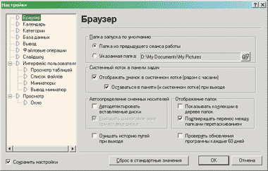 На первой странице — «Браузер» (Browser) — особое внимание стоит уделить опции «Оставаться в памяти (и системном лотке) при выходе» (Continue running in Taskbar Notification area on exit). По умолчанию эта опция выключена, однако если ваша система обладает достаточно большим ОЗУ, чтобы вы могли безболезненно пожертвовать примерно 7 Мбайт от его объема, и вы часто вызываете ACDSee, то имеет смысл включить данный параметр, поскольку это заметно ускорит повторные запуски программы. Единственное неудобство тут подстерегает пользователей файл-менеджера FAR (по крайней мере, его версии 1.70 beta 4): в таком режиме возникает проблема при просмотре графических файлов, упакованных в архивы, — сначала файл распаковывается во временную папку для просмотра, после чего FAR бесконечно долго ждет завершения процесса, а пользователь вынужден либо столько же наблюдать черный экран, либо насильственно закрывать FAR (а затем вручную удалять графический файл из временной папки). Еще одна любопытная группа параметров на странице «Браузер» — «Автоопределение сменных носителей» (Removable media auto-detection). В частности, опция «Автодетектировать вставляемые диски» (Auto-detect insertion of new discs) заставляет ACDSee выдавать на экран запрос на просмотр CD всякий раз, как в CD/DVD-дисковод будет помещен компакт-диск.