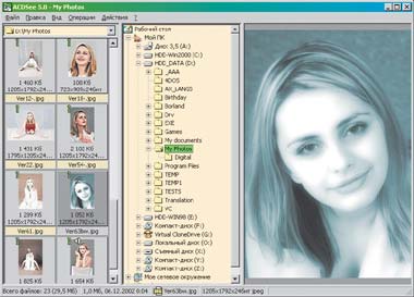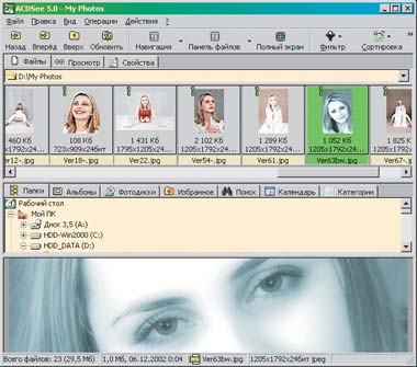 Так на что же способна ACDSee? На многое. Все функции здесь перечислять вряд ли стоит, поэтому упомяну лишь основные, доступные в стандартном комплекте поставки. А именно: просмотр более 50 графических и мультимедийных форматов, включая воспроизведение видео- и аудиоклипов, а также автоматический показ изображений с разнообразными эффектами смены (слайдшоу), преобразование изображений в 12 разных графических форматов, пакетное переименование и изменение параметров изображений (размер, поворот, уровни), добавление и редактирование описаний файлов, просмотр/воспроизведение у графических файлов дополнительной информации (EXIF, встроенный звук и др.), ведение базы данных со свойствами изображений (включая даты, метаданные, ключевые слова и т. д.) и поиск по разным критериям, формирование собственных альбомов, фотодисков, календарная сортировка изображений, их печать с разнообразными настройками. Много полезного обеспечивают подключаемые модули, например работу с архивами, получение изображений с цифровых камер, поиск дубликатов, создание HTML-альбомов... И это далеко не все. Среди отличительных особенностей ACDSee 5 нельзя не отметить и весьма редкое на сегодня явление: программа стала работать ощутимо быстрее предыдущей версии!