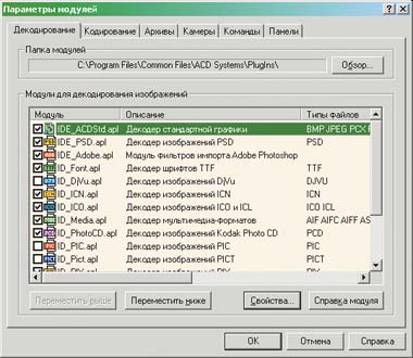 Ну а теперь просто снимаем галочки с тех модулей, которые нам не нужны (рис. 4). Кроме того, не лишним будет упорядочить модули по приоритету: чем раньше модуль стоит в списке, тем выше его приоритет. Это требуется тогда, когда один и тот же формат файла поддерживается сразу несколькими модулями. В этом случае ACDSee будет использовать модуль с наиболее высоким приоритетом, поэтому рекомендуется поместить в начало списка те модули, которые задействуются чаще всего. Например, на вкладке «Декодирование» (Image Decode) список могут открывать IDE_ACDStd.apl, ID_Font.apl, IDE_PSD. apl и т. д. Нужно лишь выделить требуемый модуль и переместить его на желаемое место кнопками «Переместить выше/ниже» (Move up/down). Аналогично следует поступить с модулями на остальных вкладках. Обратите внимание, что некоторые модули имеют собственные настройки: скажем, модуль IDE_ACDStd.apl позволяет выбрать опции декодирования для форматов GIF, JPEG и TIFF, а в модуле просмотра шрифтов TrueType допустимо задать образец текста, размер и цвет. Поэтому не поленитесь пробежаться по спискам модулей, нажимая на каждом кнопку «Свойства» (Properties), и ознакомиться с их возможностями.