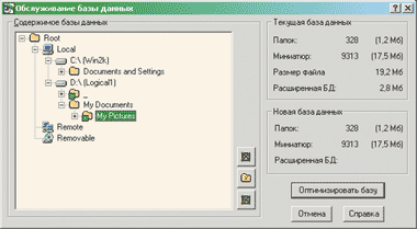 Нужно только иметь в виду, что со временем файлы базы данных могут становиться очень большими (так, примерно 9000 миниатюр при умеренном сжатии занимают в базе около 19 Мбайт) и терять эффективность из-за наличия ссылок на уже несуществующие или ненужные файлы. Поэтому не забывайте периодически следить за состоянием БД, благо это не составляет особого труда — в меню «Операции» (Tools) следует выбрать «База данных/Обслуживание базы данных» (Database/Maintenance) (рис. 6).