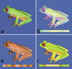 Рис. 10. Воздействие на изображение режимов смешивания: а - исходное изображение, б - режим Procedural + стиль Luminance, в - режим Hue + стиль Luminance, г - режим Difference 2 + стиль Hue Map |