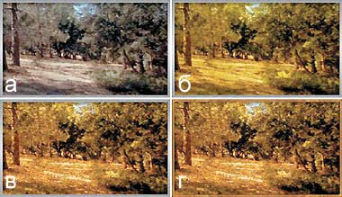 Рис. 13. Этапы обработки фотографии фильтром KPT Gradient Lab: а — исходный рисунок, б — придание фотографии желтого оттенка, в — добавление в картину красок увядания, г — создание подходящей рамки |
