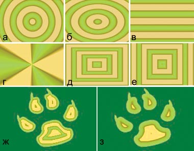Рис. 5. Действие разных стилей градиента: а — Circular («Круговой»), б — Elliptical («Эллиптический»), в — Linear («Линейный»), г — Radial («Радиальный»), д — Rectangular («Прямоугольный»), е — Square («Квадратный»), ж — Shapeburst-Angular («Отвесно-узкий контур»), з - Shapeburst-Curved («Сглаженно-широкий контур») |