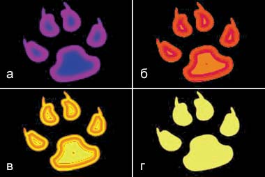 Рис. 7. Влияние стилей градиента на каналы: а — Hue Map, б — Luminance Map, в — Saturation Map, г — Selection Map |