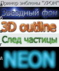 Рис. 5. Примеры надписей, полученных с помощью команд из группы «Расш.?Скрипт-Фу?Эмблема»: а — «Хром», б — «Звездный фон», в — «3D-outline», г — «След частицы», д — «Неон» |