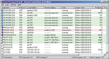 Вызвав Firewall Status, в появившемся окне можно наблюдать все TCP/IP-соединения, устанавливаемые операционной системой. Приводится детальная информация: статус (Listening — для ожидающих, Connected In — для соединений, установленных удаленным компьютером с локальным сервисом, Connected Out — для соединений, установленных локальным приложением с удаленным сервером), протокол (TCP или UDP), адрес удаленного компьютера, время создания соединения, количество полученной и переданной информации в байтах (Rx/Tx), средняя скорость получения и передачи в килобайтах (Rx Speed/Tx Speed). Внизу окна выводится текущая статистика соединений: количество ожидающих и установленных TCP- и UDP-соединений, средняя скорость передачи/получения данных.