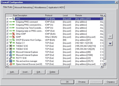 Check All Paths проверяет существование всех программ, внесенных в список. Если программа не найдена указанным путем, то брандмауэр запросит пользователя об удалении записи для этой программы. Check MD5 Now проверяет подлинность программы для выбранной записи. При несовпадении цифровой подписи брандмауэр запросит пользователя об изменении записи. Примечание: можно одновременно выбрать несколько записей, используя клавиши или .