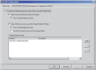 - компьютер подключен к локальной сети, клиентам которой вы доверяете и хотите разрешить доступ к открытым ресурсам и принтерам вашего компьютера. Установите все опции, кроме Ask Me For Each Access to My Shared Folder ("Cпрашивать меня каждый раз при попытке доступа к открытым ресурсам компьютера"). В группе Trusted Address Group определите IP-адреса клиентов сети Microsoft, которым вы разрешаете доступ к ресурсам;