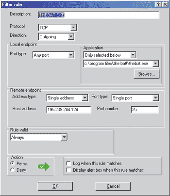 По умолчанию брандмауэр работает как сервис (запускается при загрузке системы). Уровень безопасности установлен в Ask Me First. Оставьте его на время настройки сетевой безопасности. Зафиксировав попытку какого-либо системного сервиса или пользовательского приложения установить сетевое соединение, брандмауэр блокирует данное соединение и запросит пользователя о его разрешении (Permit) или запрещении (Deny). Указав опцию Create appropriate filter rule and don?t ask me again, вы даете брандмауэру распоряжение создать правило, описывающее данный тип соединений для данного приложения. Выбрав Customize rule, можно просмотреть характеристики создаваемого правила и изменить их.