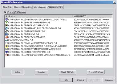 Опция Check MD5 Signature включает/отключает проверку подлинности программ, участвующих в соединении. Delete удаляет выбранные записи из списка. Select All выбирает все записи из списка.